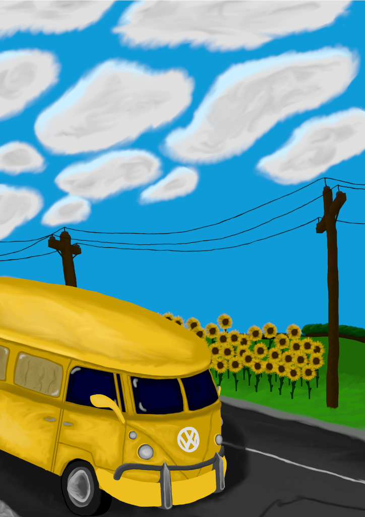She was bright yellow. As yellow as the Common Sunflower. And like a sunflower her days were spent following the sun. Her logo, a circle with a ‘V’ and a ‘W’ were painted black and hung on the front like a nose. Her windshield like two eyes taking in all there was to see. Her bumper was her smile, happy to be traveling on any adventure short or long. Ah! The memories made in that Volkswagen van.