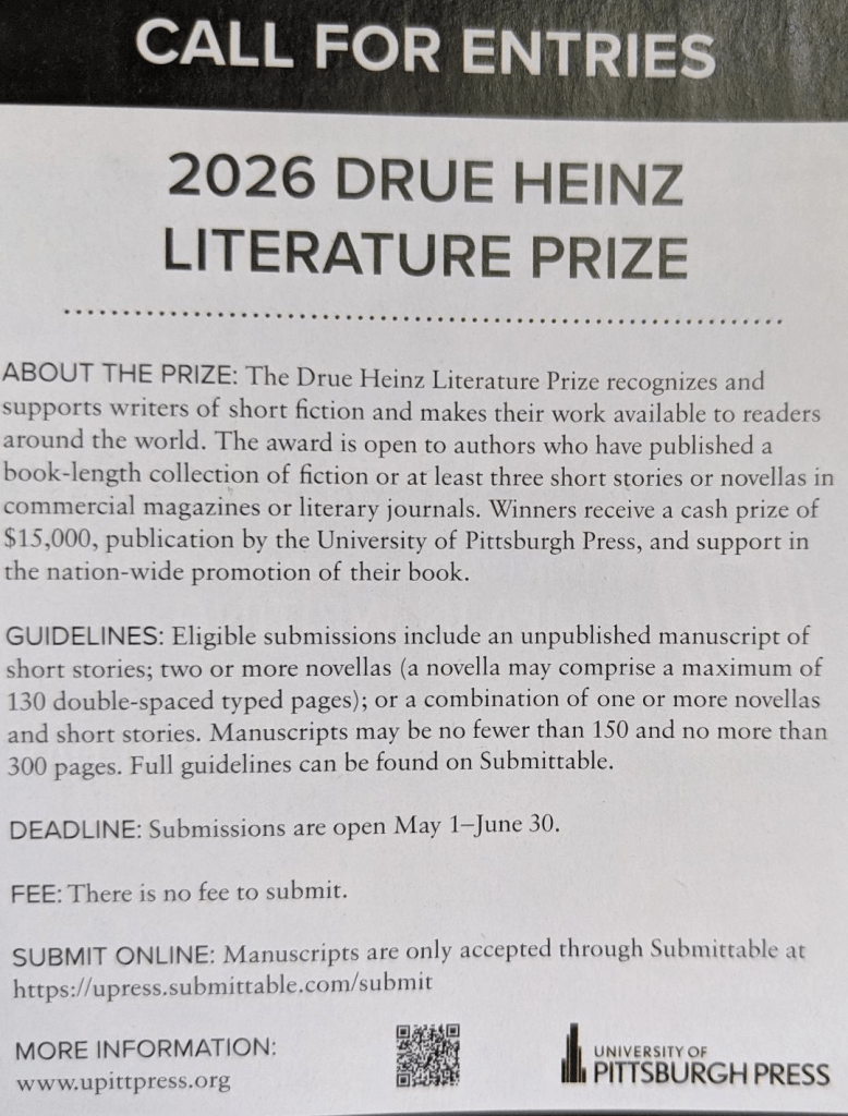 13th annual Literary Awards fiction – nonfiction – poetry $5,000 in prize money First – through third- place winners also earn scholarships to the 2-day Masters Workshop that follows the March 2025 festival. There, they will work with faculty of distinguished U.S. writers.